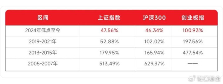我们选取了上证指数、沪深300、创业板指,将本轮行情和2019-2021年、2013-2015年、2005-2007年牛市进行了从最低点到高点的累计涨幅对比。